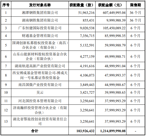 据公开资料显示,华菱线缆本次发行对象最终确定为13名,其中湘潭钢铁集团有限公司、湖南钢铁集团有限公司认购的股份自发行结束并上市之日起36个月内不得转让,其他发行对象认购的股份自发行结束并上市之日起6个月内不得转让。公司本次发行募集资金总额1,214,899,990.08元,募集资金净额为1,211,094,587.80元。