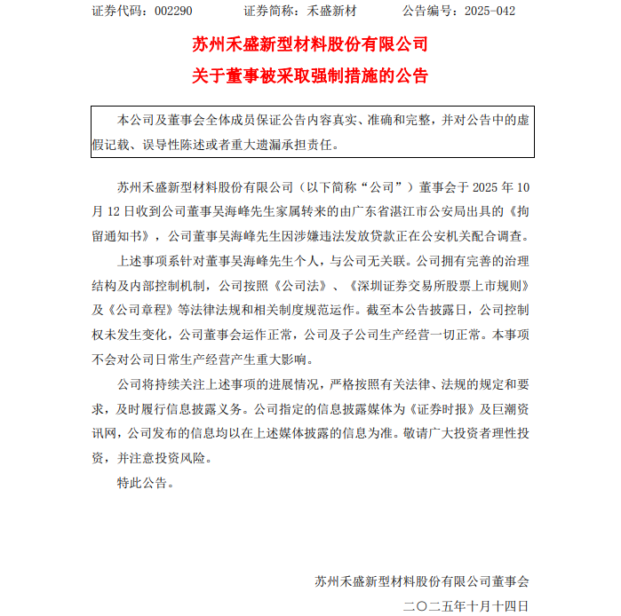 10月14日,苏州禾盛新型材料股份有限公司(证券代码:002290、证券简称:禾盛新材)发布公告称,公司董事会于2025年10月12日收到公司董事吴海峰先生家属转来的由广东省湛江市公安局出具的《拘留通知书》,公司董事吴海峰先生因涉嫌违法发放贷款正在公安机关配合调查。