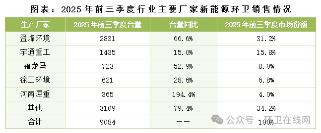 新能源环卫市场呈现高集中度特征,CR5占比高达65.8%。2025年前三季度,盈峰环境凭借2831台的销量,领先优势明显。宇通重工、福龙马、徐工环境分列二、三、四位。