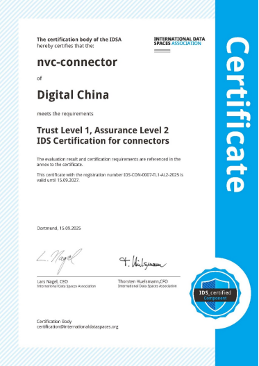 近日,神州数码磐云数据空间连接器(nvc-connector)顺利通过下一代互联网国家工程中心的评估,获得了国际数据空间(IDS)组件认证。该成果不仅标志着产品在技术合规性、安全性与国际互操作性上符合了国际要求,实现了与国际数据空间标准的全面对齐,更为国内数据空间生态的标准化建设提供了关键实践标杆。