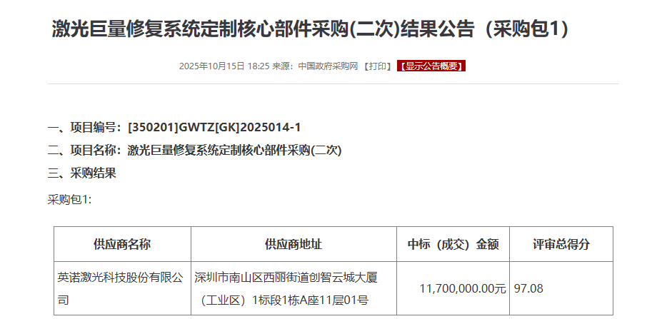 10月15日,根据《激光巨量修复系统定制核心部件采购(二次)》,英诺激光成功中标嘉庚创新实验室采购项目,中标金额为1170万元。