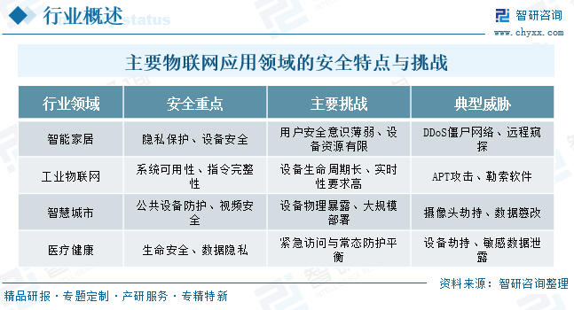 物联网在不同应用领域的安全特点和挑战各异:智能家居侧重隐私保护和设备安全,但面临用户意识薄弱和设备资源有限的挑战,易受DDoS攻击和远程窥探;工业物联网强调系统可用性和指令完整性,但设备生命周期长且实时性要求高,易受APT攻击和勒索软件威胁;智慧城市需保障公共设备防护和视频安全,但大规模部署和物理暴露风险导致摄像头劫持和数据篡改隐患;医疗健康领域关乎生命安全与数据隐私,需平衡紧急访问与常态防护,防范设备劫持和敏感数据泄露。各领域均需针对其特性构建差异化安全防护体系。