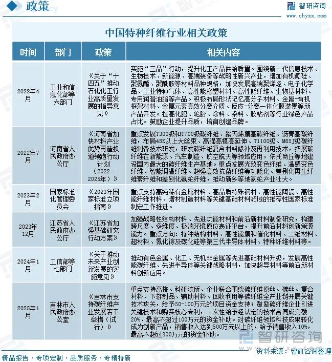 注:本文节选出自智研咨询发布的《研判2025!中国特种纤维行业发展历程、政策、发展现状、竞争格局及前景展望:航空航天等领域需求旺盛,推动特种纤维规模持续扩张[图]》行业分析文章,如需获取行业文章全部内容,可进入智研咨询搜索查看。