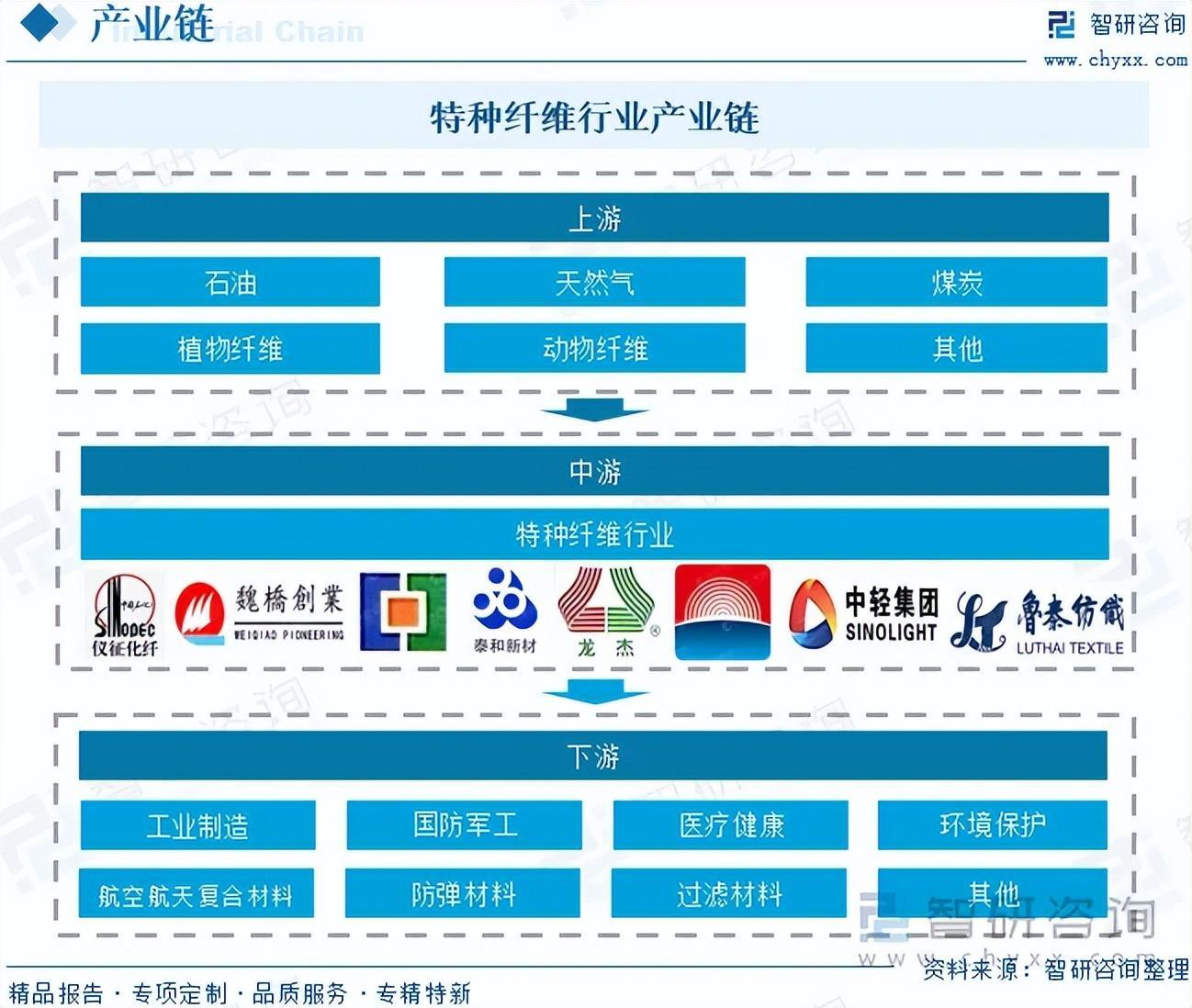 特种纤维产业链上游为原材料,包括石油、天然气、煤炭等化石原料,以及植物纤维、动物纤维等天然原料。产业链中游为特种纤维的生产和加工环节,包括纤维的纺丝、拉伸、热处理、表面处理等工艺环节。产业链下游为特种纤维的应用领域,包括工业制造、国防军工、医疗健康、环境保护、航空航天复合材料、防弹材料、过滤材料等。