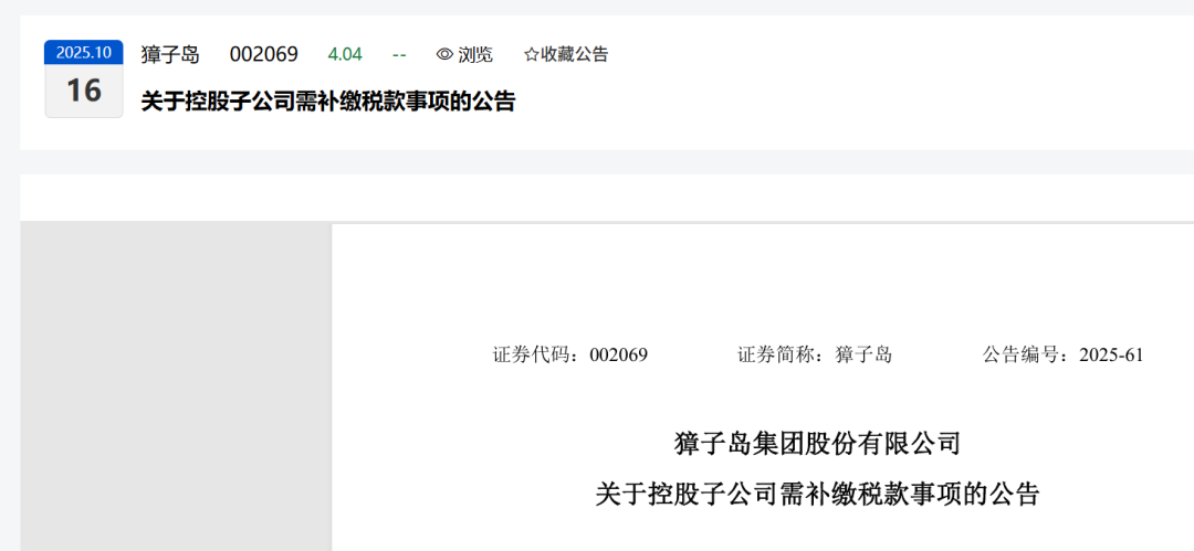 獐子岛于 10 月 15 日通过公告透露,其控股子公司青岛前沿海洋种业因税收优惠适用问题,需为2019-2021 年度补缴企业所得税及滞纳金,总金额约 2154 万元。值得注意的是,此次补缴中的滞纳金达 935 万元,几乎占了总支出的五成;而问题根源在于,税务机关认定该子公司的合作育苗业务所得,不满足 “海水养殖减半征收企业所得税” 的政策要求。
