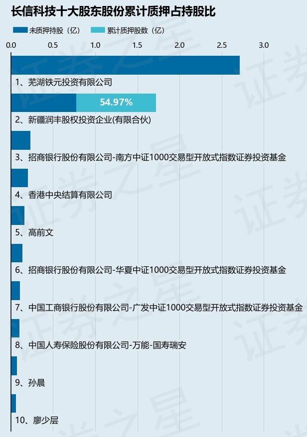 截止本公告日,股东新疆润丰股权投资企业(有限合伙)已累计质押股份9462.5万股,占其持股总数的54.97%。本次质押后长信科技十大股东的累计质押股份占持股比例(占持股比例的计算以公司最新一期财务报表公布的十大股东的持股总数为基准)见下图:
