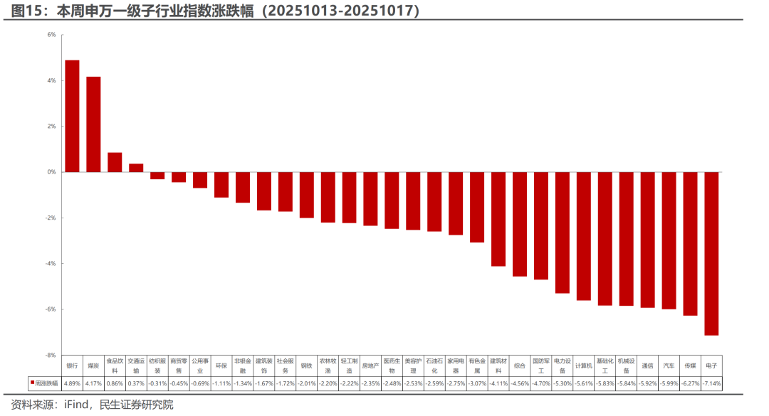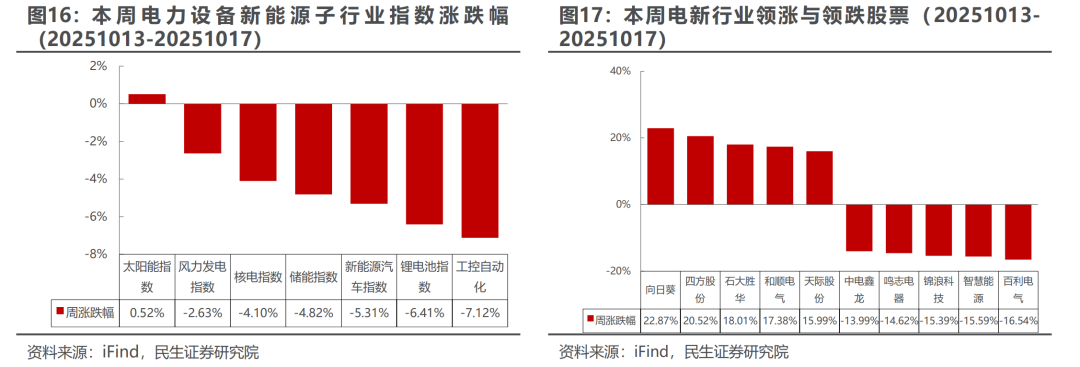 电力设备与新能源板块:本周下跌5.30%,涨跌幅排名第24,弱于上证指数。沪指收于3839.76点,下跌57.27点,跌幅1.47%,成交49993.96亿元;深成指收于12688.94点,下跌666.48点,跌幅4.99%,成交58737.02亿元;创业板收于2935.37点,下跌177.89点,跌幅5.71%,成交26198.63亿元;电气设备收于9435.18点,下跌527.97点,跌幅5.30%,弱于上证指数。