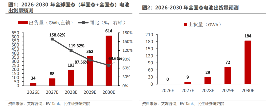 从市场发展前景来看,固态电池产业正加速步入规模化增长阶段。EV Tank、艾媒咨询数据显示,全球固态电池出货量预计从2026年的34GWh上升至2030年的614GWh,市场规模呈扩张趋势。全固态电池在整体市场中的占比预计由2027年的10%逐步增长至2030年的30%。
