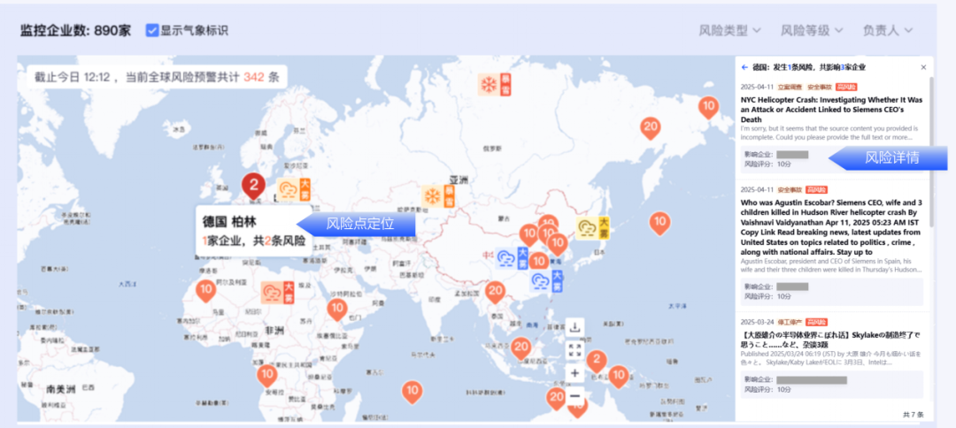 其风险监测范围覆盖全球220多个国家与地区,支持130多种语言实时翻译,接入超30万个多渠道数据源,包括各国地震局、气象局及主流媒体等,可规避原材料供应、生产经营、物流运输等181项供应中断风险,助力企业“一眼洞察全局”。