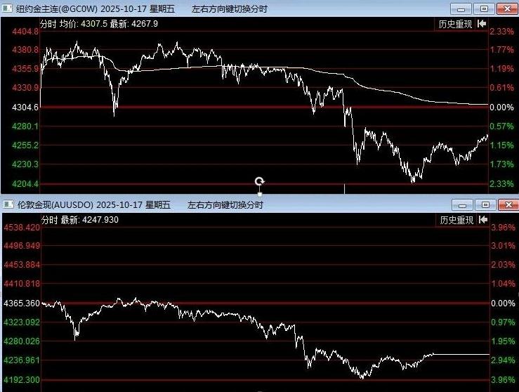 其中,17日COMEX黄金白盘一度刷新历史新高至4392美元/盎司,夜盘迅速跳水跌超2%,最低下探至4229.7美元/盎司,振幅高达4.55%;与此同时,伦敦金当日收跌2.69%,一度失守4200美元。值得注意的是,自年初以来,黄金累计涨幅超60%,业内机构提醒,黄金在快速上涨后累计了一定盈利仓位,注意可能的调整和波动加剧。>>>领先市场15分钟 马上解锁国际黄金实时行情