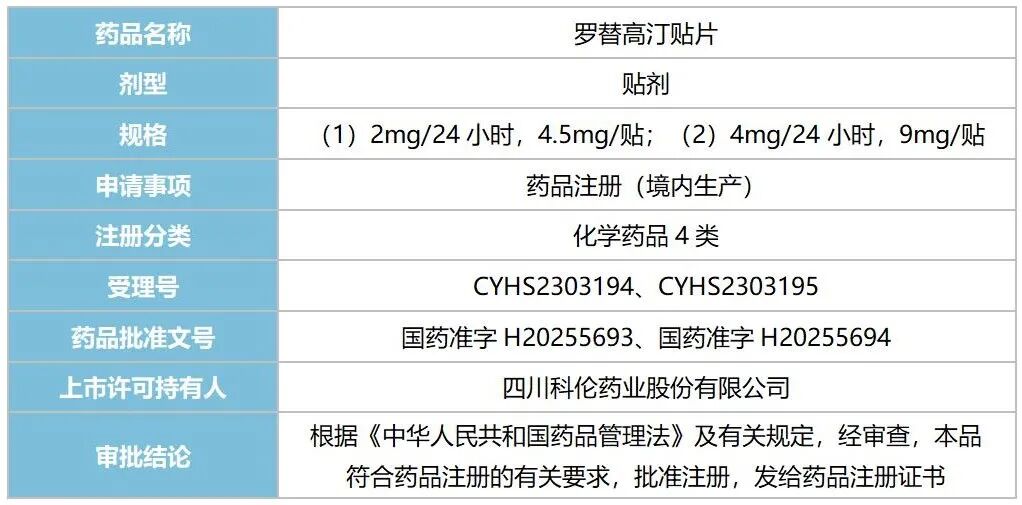 仿制药申报方面,3家国内药企的罗替高汀贴片以新注册分类报产,其中四川科伦药业的产品于近日顺利获批,拿下国内首仿;北京泰德制药、北京福元医药的产品还在审评审批中。