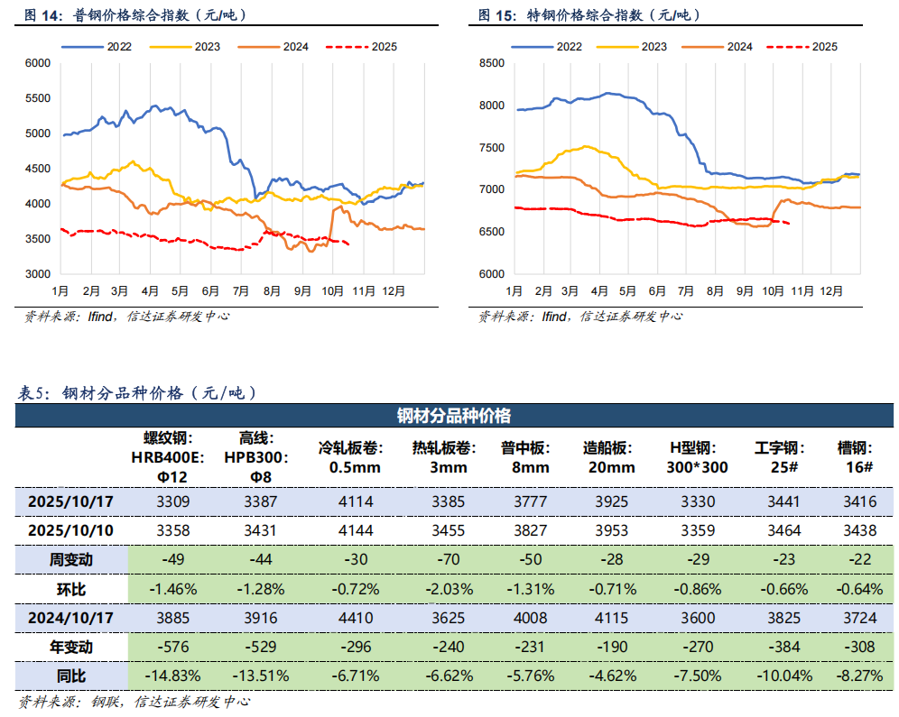 本周,截至10月17日,日均铁水产量为240.95万吨,周环比下降0.59万吨,同比增加7.87万吨。五大钢材品种社会库存周环比下降0.21%,五大钢材品种厂内库存周环比下降3.42%。本周,日照港澳洲粉矿(62%Fe)下跌12.0元/吨,京唐港主焦煤库提价上涨30.0元/吨。需注意的是,据应急管理部获悉,11月份,22个中央安全生产考核巡查组将陆续进驻31个省、自治区、直辖市和新疆生产建设兵团开展年度考核巡查。受理范围主要包括:涉及安全生产相关的重大问题隐患、安全生产非法违法行为等,同时受理有关部门和企业一线干部职工反映各级各部门在落实安全生产责任上存在的问题、加强和改进安全生产工作的建议。此外,近期国家发展改革委、市场监管总局发布《关于治理价格无序竞争维护良好市场价格秩序的公告》。《公告》提出,价格竞争是市场竞争的重要方式之一,但无序竞争会对行业发展、产品创新、质量安全等造成负面影响,不利于国民经济健康发展。国家支持公平、公开、合法的市场竞争,维护正常的价格秩序。总体上,反内卷背景下,通过安全生产监查及抑制无序竞争和过剩产能释放,钢铁行业产能管理有望进一步加强。我们认为,在海外关税影响下,出口占比较低的普钢公司受影响较小,叠加国家“稳增长”政策下,房地产、基建等行业用钢需求有望边际改善。当前,普钢吨钢利润可观,在行业“反内卷”背景下,普钢公司业绩改善空间较大,有望迎来价值修复,钢铁板块亦有望迎来配置良机。