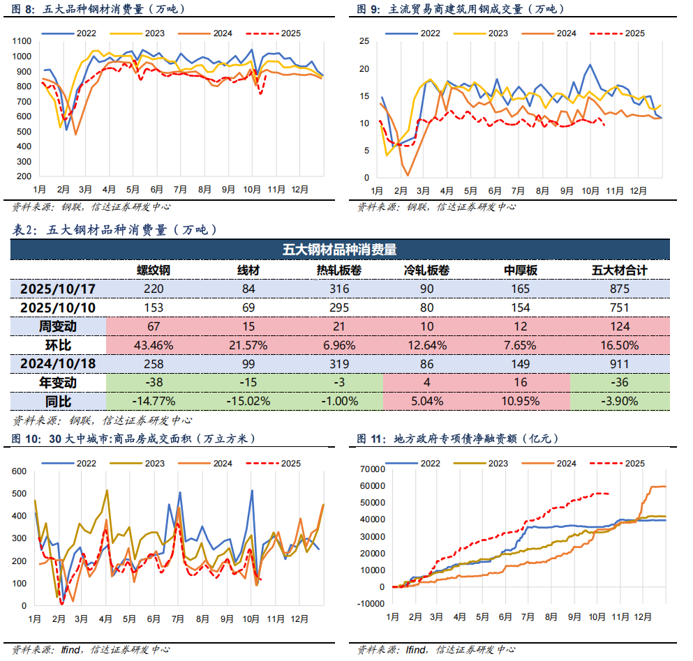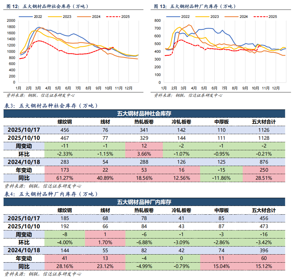 ⚫ 五大钢材品种社会库存:截至10月17日,五大钢材品种社会库存1125.8万吨,周环比下降2.32万吨,周环比下降0.21%,同比增加28.51%。