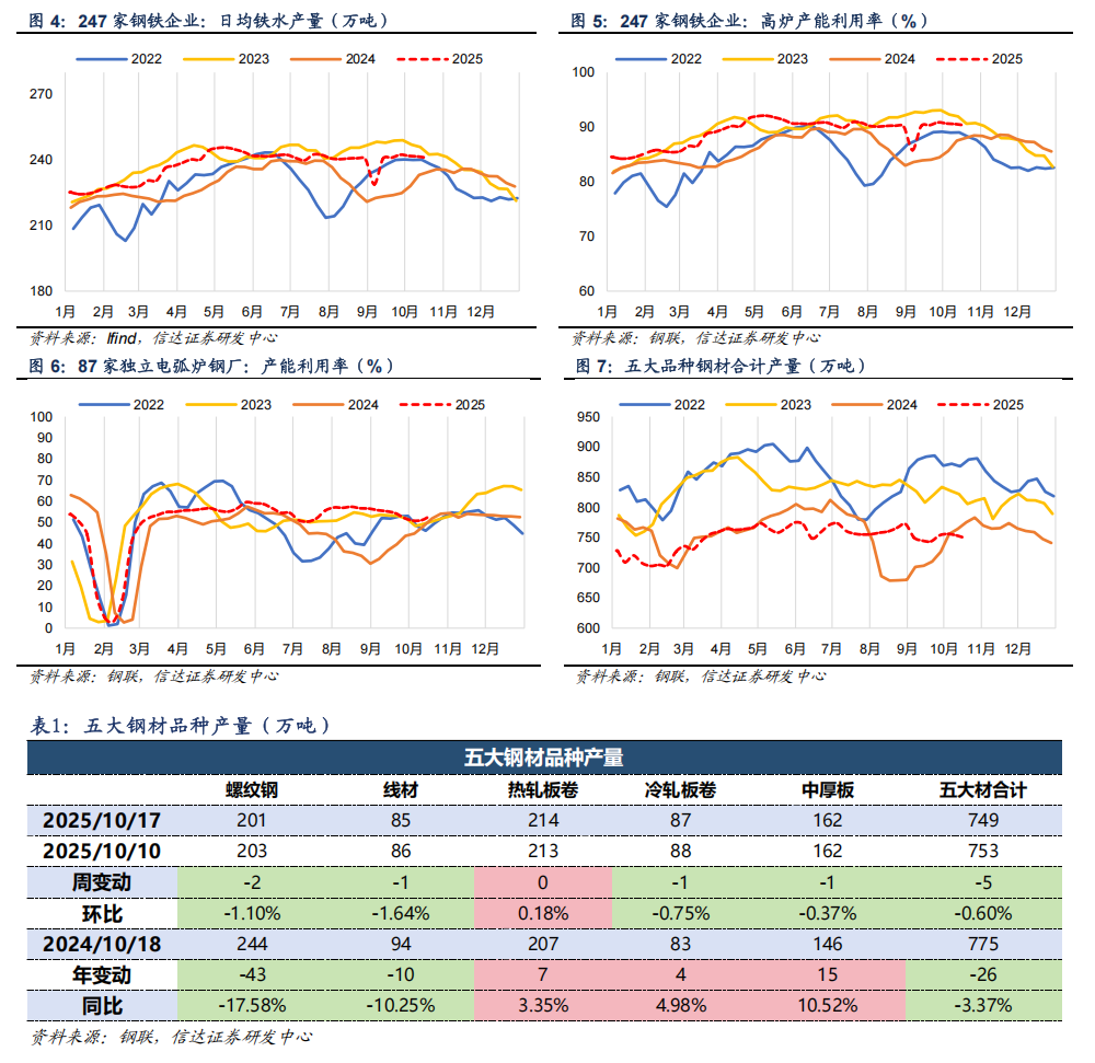 ⚫ 五大钢材品种产量:截至10月17日,五大钢材品种产量748.9万吨,周环比下降4.52万吨,周环比下降0.60%。