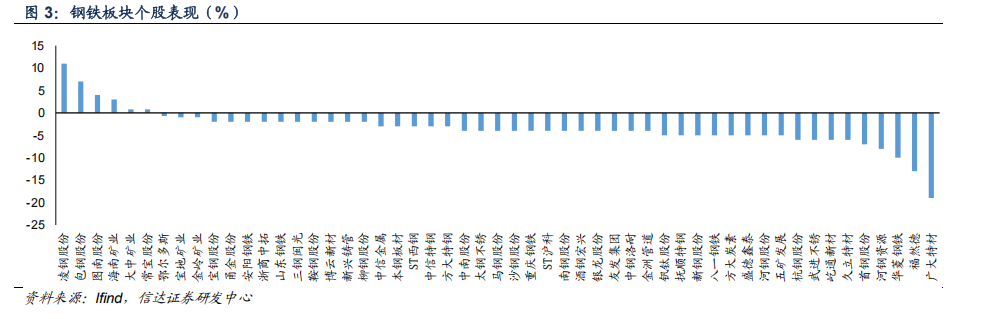 本周钢铁板块中涨跌幅前三的分别为凌钢股份(10.50%)、包钢股份(6.69%)、图南股份(3.70%)。