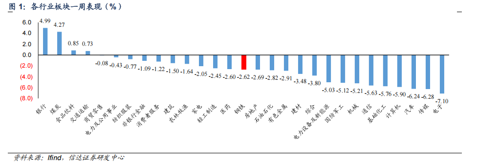 本周钢铁板块下跌2.62%,表现劣于大盘;本周沪深300下跌2.22%到4514.23;涨跌幅前三的行业分别是银行(4.99%)、煤炭(4.27%)、食品饮料(0.85%)。
