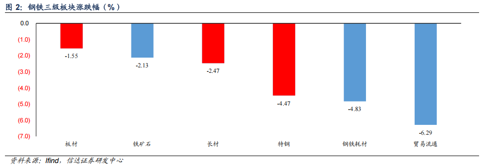 本周特钢板块下跌4.47%,长材板块下跌2.47%,板材板块下跌1.55%;铁矿石板块下跌2.13%,钢铁耗材板块下跌4.83%,贸易流通板块下跌6.285%。