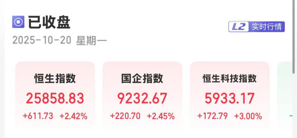 上证报中国证券网讯(卢伊 记者 严晓菲)10月20日,港股三大指数集体收涨。截至收盘,恒生指数涨2.42%,报25858.83点;恒生国企指数涨2.45%,报9232.67点;恒生科技指数涨3%,报5933.17点。