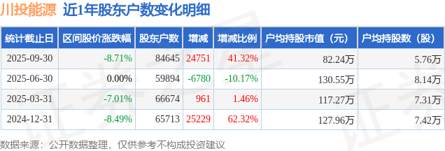 从股价来看,2025年6月30日至2025年9月30日,川投能源区间跌幅为8.71%,在此期间股东户数增加2.48万户,增幅为41.32%。