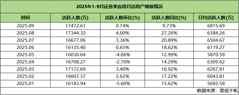 在A股市场持续活跃与新开户数大幅增长的推动下,证券服务类App用户规模延续增长态势。易观千帆最新数据显示,9月证券服务类App月活跃用户数攀升至1.74亿人,同比提升9.73%,再度刷新年内月活纪录。