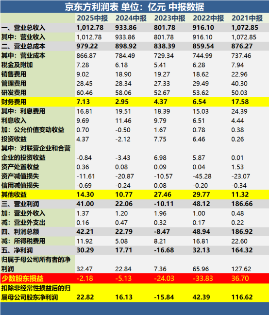 上面这些都很常见,京东方的利润表还有两个特色数据,一是少数股东亏损多年为负数,二是其他收益高。