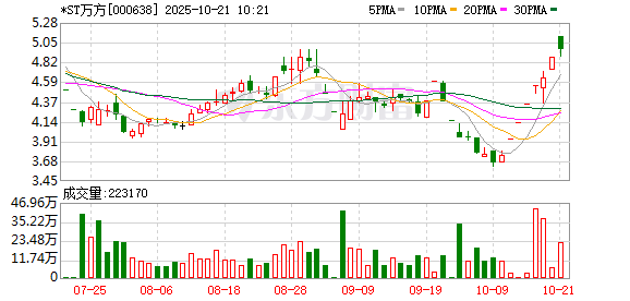 *ST万方(维权)再度涨停,7个交易日内录得6个涨停,累计涨幅为36.90%,累计换手率为31.40%。截至9:25,该股今日成交量111.12万股,成交金额568.93万元,换手率0.36%。最新A股总市值达15.94亿元,A股流通市值15.88亿元。