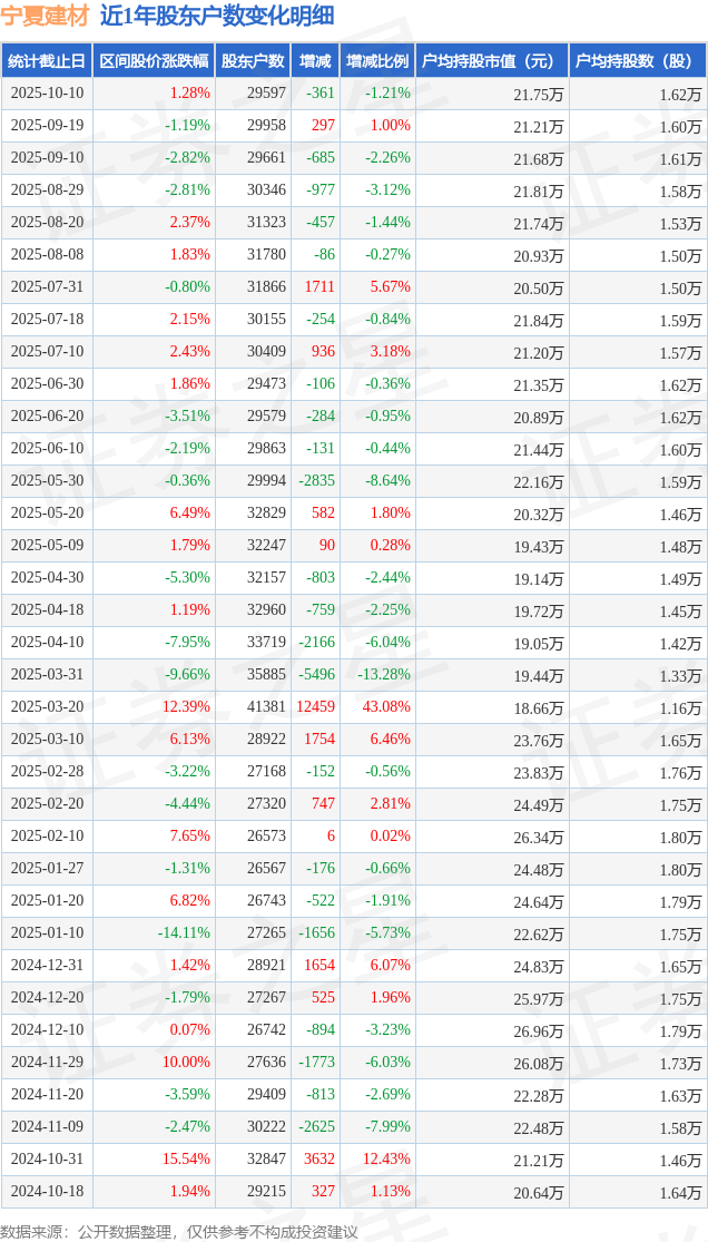 从股价来看,2025年9月30日至2025年10月10日,宁夏建材区间涨幅为2.2%,在此期间股东户数增加251.0户,增幅为0.86%。