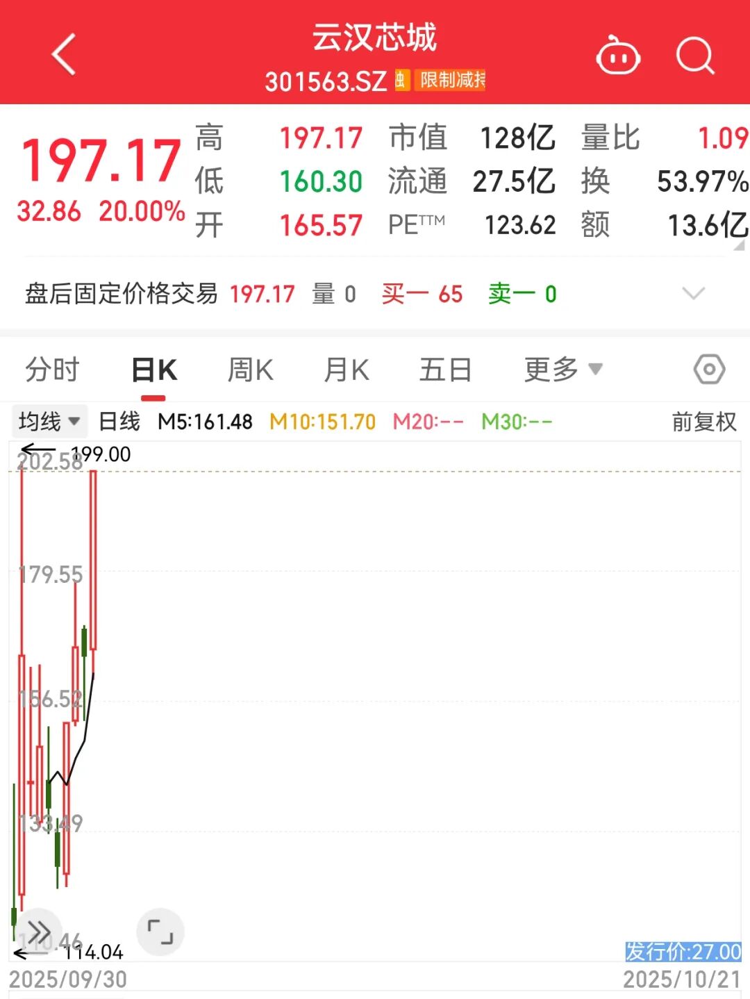 其中,云汉芯城(301563)也录得“20cm”涨停,该股是9月30日上市的次新股,今天涨停后股价创出收盘新高。值得一提的是,今天该股全天换手率接近54%,高居市场第二位。业内人士表示,云汉芯城之所有热度爆棚,主要是该股具有存储芯片、AI智能体、PCB、机器人和DeepSeek等多个热门科技概念。
