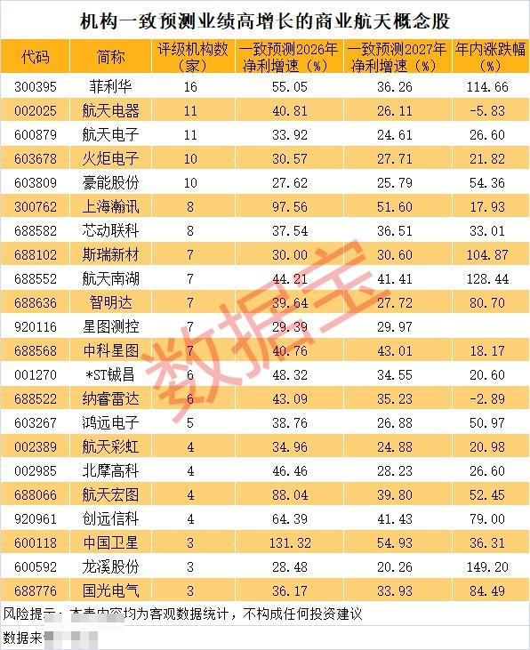 据证券时报·数据宝统计,A股中商业航天概念股有60余只。从机构关注度来看,菲利华、中航西飞、航天电器、航天电子等个股机构关注度较高,均有10家及以上机构评级;上海瀚讯、芯动联科、宗申动力等个股均有5家以上机构评级。