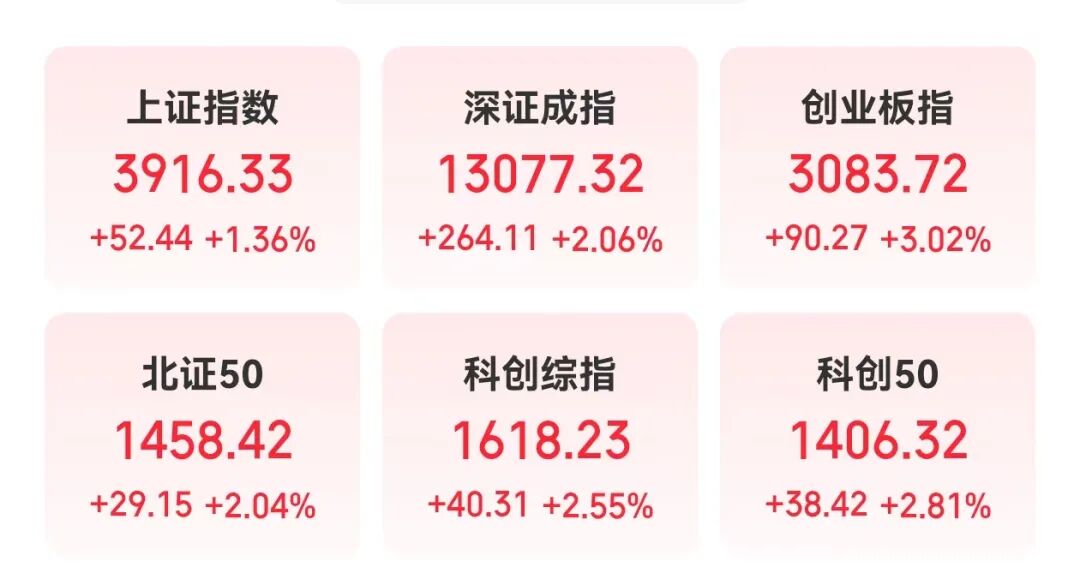 今天(10月21日)A股主要指数全线上涨,上证指数重回3900点大关,创业板指和科创50涨幅均超2.8%。全市场成交额近1.9万亿元,较上一交易日放量超1300亿元,上涨个股超4600只。涨幅在20%以上的个股多达11只,微创光电、中裕科技两只个股“30cm”涨停,正元地信、芳源股份等多只个股“20cm”涨停。
