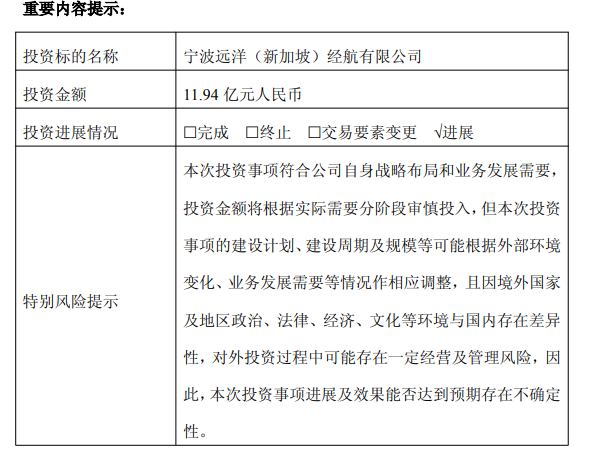 2025年9月6日,宁波远洋审议通过了《关于投资设立宁波远洋(新加坡)经航有限公司的议案》,同意公司通过现有全资子公司宁波远洋(新加坡)有限公司在新加坡全资设立宁波远洋(新加坡)经航有限公司,负责投建运营4艘2700TEU集装箱船项目,投资总额约为11.94亿元人民币,投资资金主要用于投建船舶项目和境外公司前期设立及运营,并同意授权公司经营管理层及其授权人全权办理公司在境外设立公司的全部事宜。
