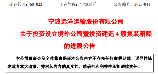 为进一步优化公司船队结构,拓展船队规模,持续加强公司航线服务能力,2025年4月28日,宁波远洋董事会同意公司或其子公司使用不超过14亿元人民币投资建造4艘2700TEU集装箱船,并同意授权公司经营管理层及相关职能部门进行拟建造船舶的市场考察,通过招投标方式择优确定船舶建造厂商,签署相关合同等与拟建造船舶相关事宜。
