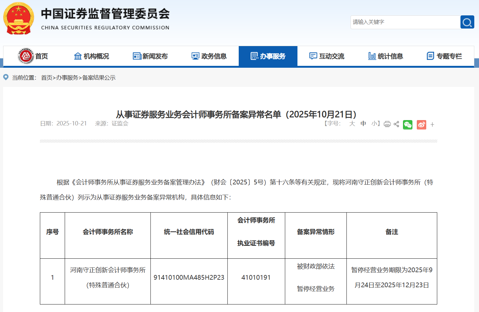 10月21日,证监会官网披露从事证券服务业务会计师事务所备案异常名单,河南守正创新会计师事务所(特殊普通合伙)被财政部依法暂停经营业务,暂停经营业务期限为2025年9月24日至12月23日。