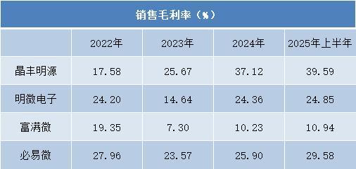 相比之下,明微电子与富满微的营收在此期间呈现小幅下滑趋势。明微电子从2022年的6.85亿元逐步回落至2024年的6.07亿元;富满微亦从7.71亿元降至6.82亿元,2025年上半年分别为2.86亿元与3.83亿元,反映出其在部分细分市场面临压力。