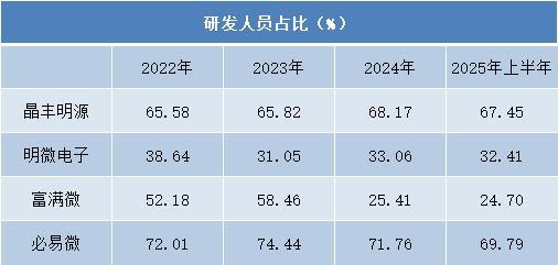 从研发人员占比来看,必易微持续领先行业,始终保持在70%左右的高位,显示出典型的研发驱动型企业特征。晶丰明源的研发人员占比同样保持在较高水平,从2022年的65.58%提升至2025年上半年的67.45%。