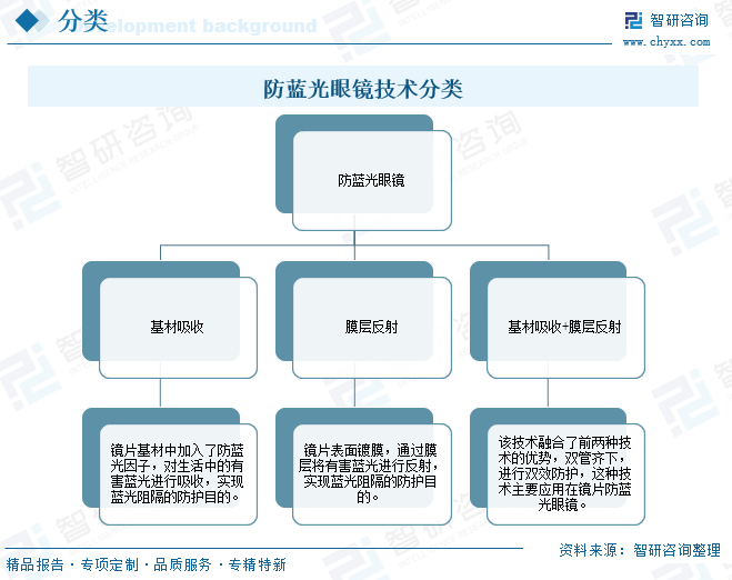 根据技术分类,防蓝光眼镜主要分为三种:基材吸收、膜层反射、基材吸收+膜层反射。其中基材吸收是指镜片基材中加入了防蓝光因子,对生活中的有害蓝光进行吸收,实现蓝光阻隔的防护目的。膜层反射是指镜片表面镀膜,通过膜层将有害蓝光进行反射,实现蓝光阻隔的防护目的。基材吸收+膜层反射是指融合了前两种技术的优势,双管齐下,进行双效防护,这种技术主要应用在镜片防蓝光眼镜。