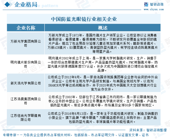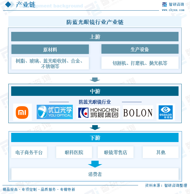 从产业链来看,防蓝光眼镜行业上游主要包括树脂、玻璃、蓝光吸收剂、合金、不锈钢等原材料,以及切割机、打磨机、抛光机等生产设备。中游是指防蓝光眼镜产品的生产制造。下游是指防蓝光眼镜的销售渠道,包括电子商务平台、眼科医院、眼镜零售店等。通过这些渠道最终将产品销售给终端消费者。