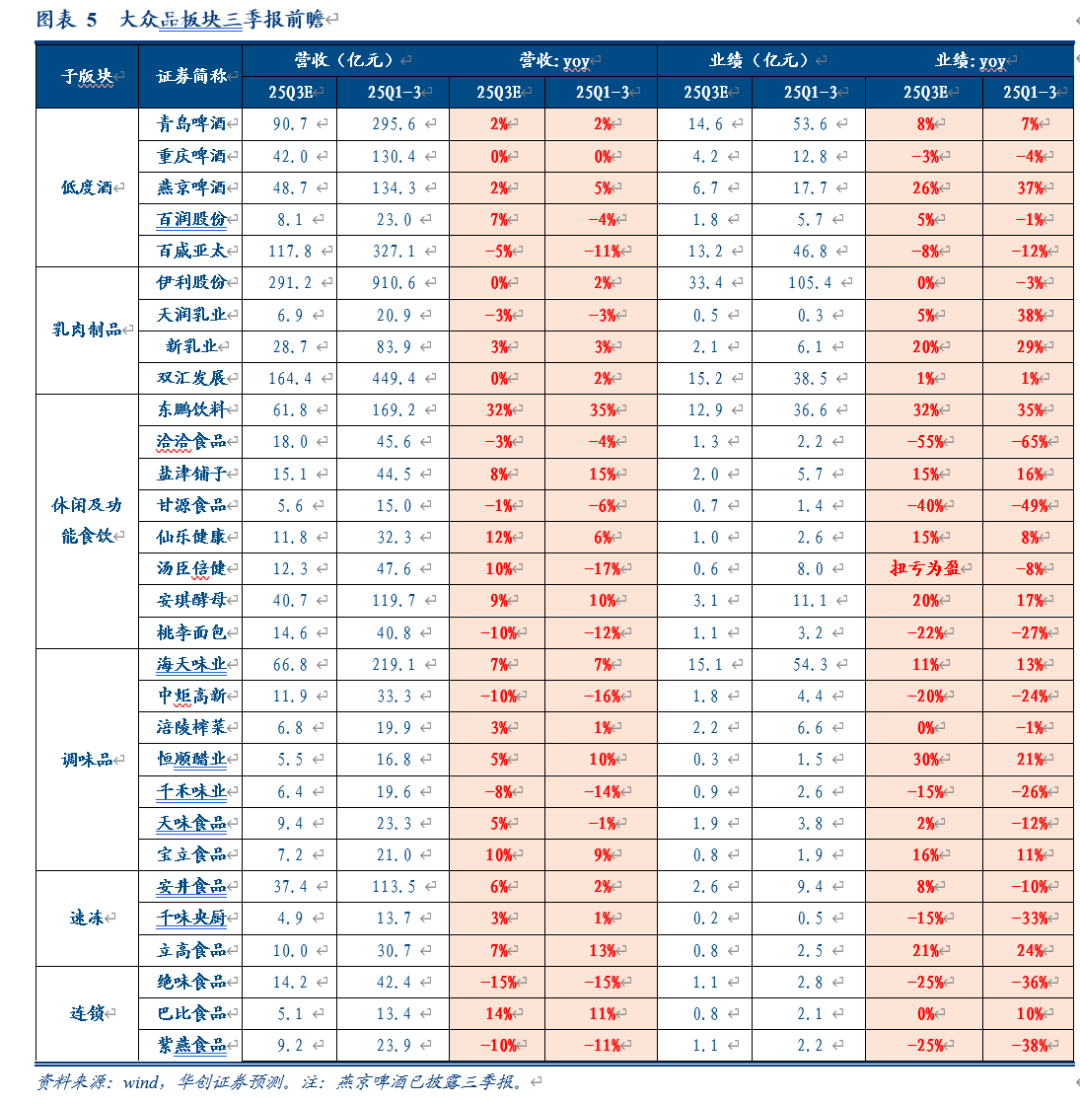 调味品:龙头势能延续,企业表现分化。预计Q3海天收入/利润分别同比+7%/+11%,中炬同比-10%/-20%,千禾同比-8%/-15%,榨菜同比+3%/+0%,恒顺同比+5%/+30%,天味同比+5%/+2%,宝立同比+10%/+16%。