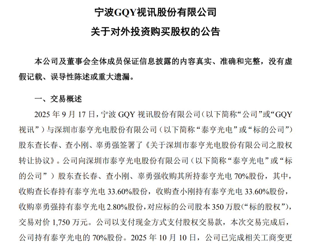 10月20日晚间,GQY视讯发布公告,以自有资金1750万元收购深圳市泰亨光电股份有限公司(以下简称泰亨光电)70%股份。