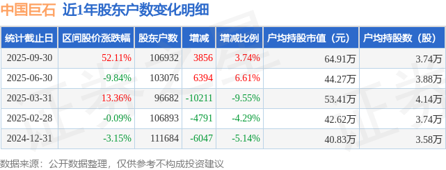 从股价来看,2025年6月30日至2025年9月30日,中国巨石区间涨幅为52.11%,在此期间股东户数增加3856.0户,增幅为3.74%。
