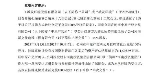 10月21日,城发环境发布该项资产出售进展公告,公告称,2025年9月15日至2025年10月17日,公司在中原产交所公开挂牌转让沃克曼100%股权,挂牌底价以经有权国资监管部门备案后的资产评估结果确定为1.15亿元。经中原产交所确认,河南投资集团作为唯一意向受让方报名参与并根据挂牌条件缴纳了保证金,成为本次挂牌的受让方,其拟以挂牌底价受让沃克曼100%股权。