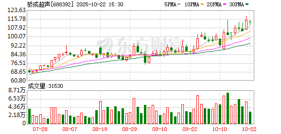 证券时报·数据宝统计显示,骄成超声今日收盘价为113.30元,下跌1.09%,日换手率为2.72%,成交额为3.53亿元,全天主力资金净流入207.13万元,近5日该股累计上涨9.95%,近5日资金合计净流出3715.58万元。