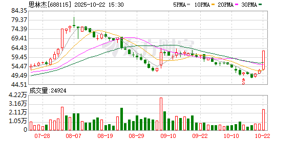 10月22日思林杰(688115)收盘价62.81元,收盘涨停,全天换手率3.74%,振幅20.37%,成交额1.46亿元。科创板交易公开信息显示,当日该股因日收盘价涨幅达15%等上榜。