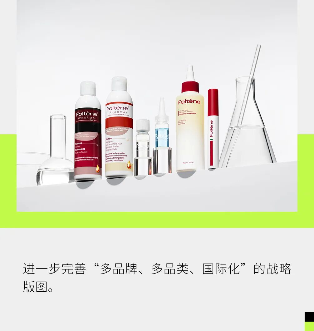 2024年以来,该集团明显提速多品类战略布局:年初承接高端头皮护理品牌馥绿德雅中国业务,6月官宣收购医用护肤品牌百植萃填补护肤板块空白,仅四个月后再度出手,将意大利科技防脱品牌Foltène丰添纳入麾下。