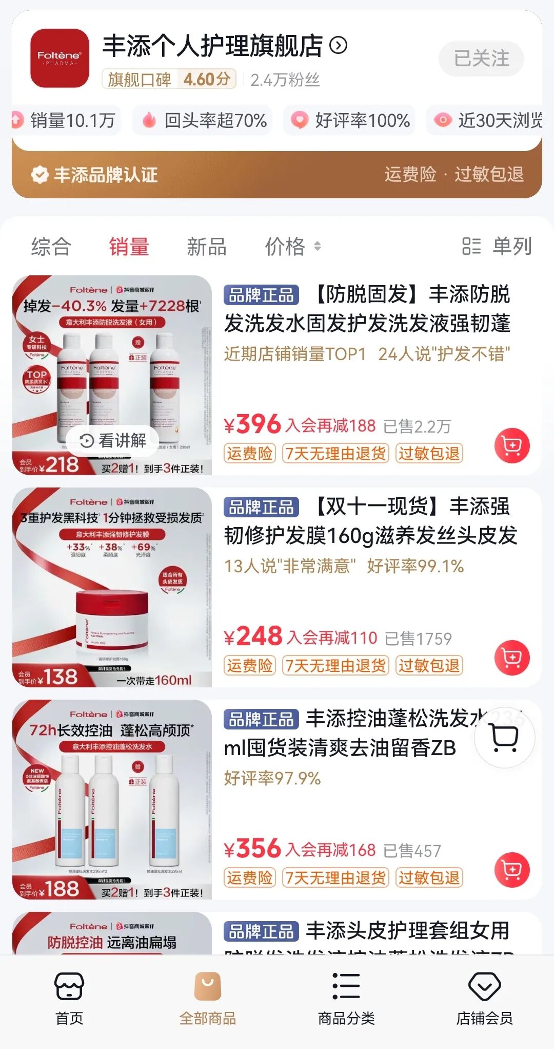 在抖音平台,“丰添个人护理旗舰店”显示5年老店,粉丝2.4万,总销量10.1万件。细分品类中,女士防脱洗发水以2.2万件的销量持续领跑,而定价248元/160g的强韧修护发膜紧随其后,售出1758件。