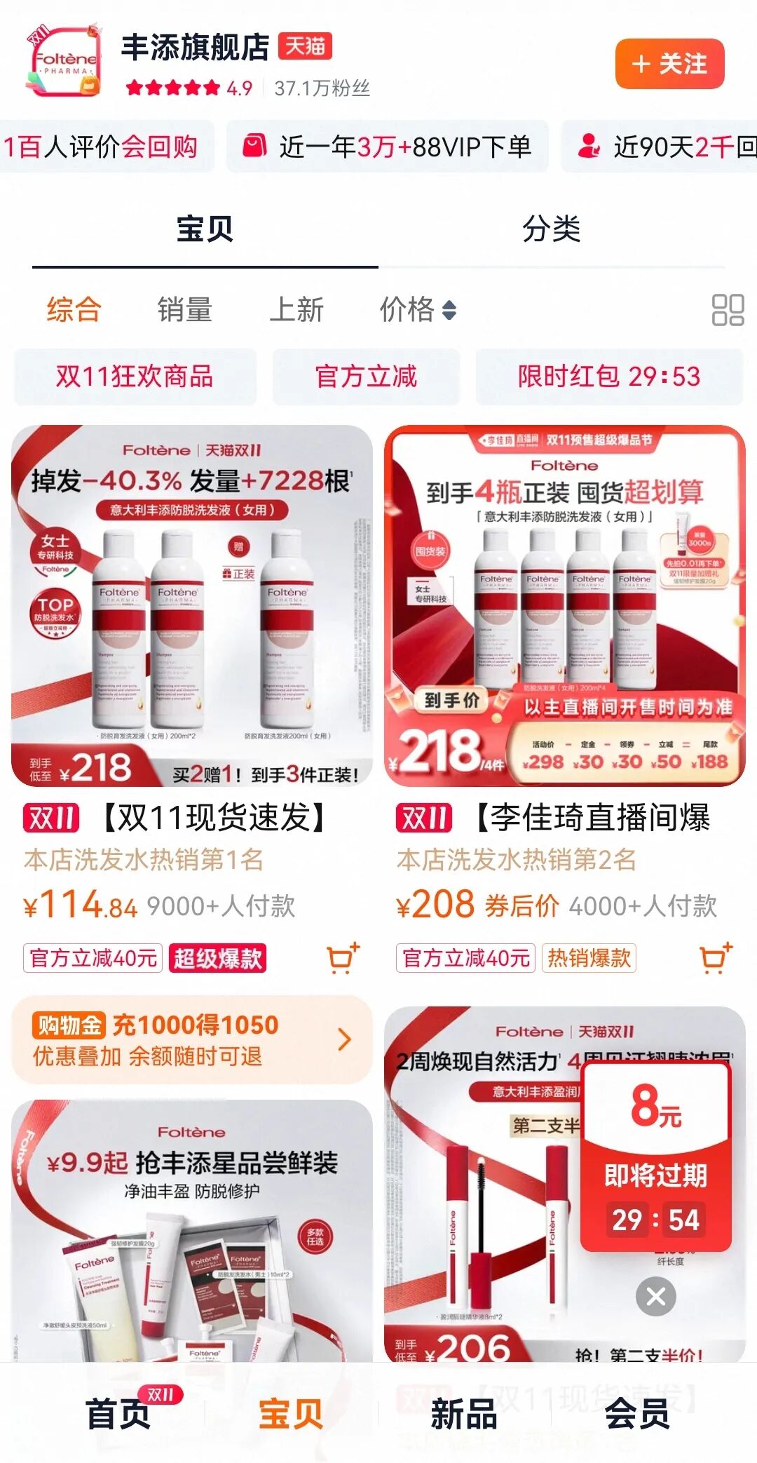 品牌线上布局方面,Foltène丰添于2013年入驻天猫。目前,其在国内主流电商平台天猫、京东、抖音上,均能找到丰添开设的旗舰店铺。其中,丰添天猫旗舰店的粉丝是37.1万,销量最高的产品是一款丰添女士防脱洗发水,月销9000+,200ml券后价106.84元,更在今年双11期间登陆头部主播李佳琦直播间,进一步触达泛人群市场。