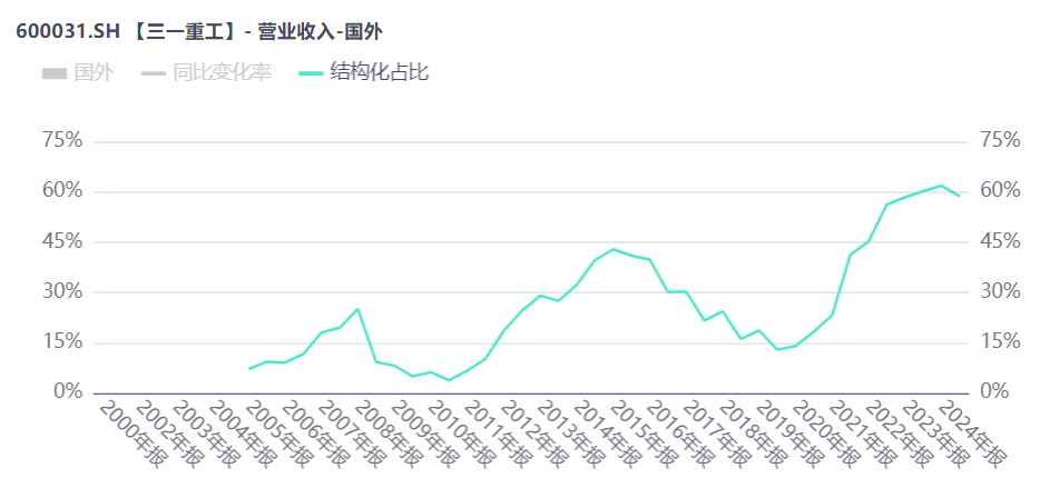 更大的需求在于海外。三一重工的海外收入占比已经达到了60%左右。