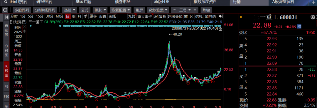 这些都已经反映在三一重工的股价上了。从底部的不到12块,涨到阶段高点接近24块。