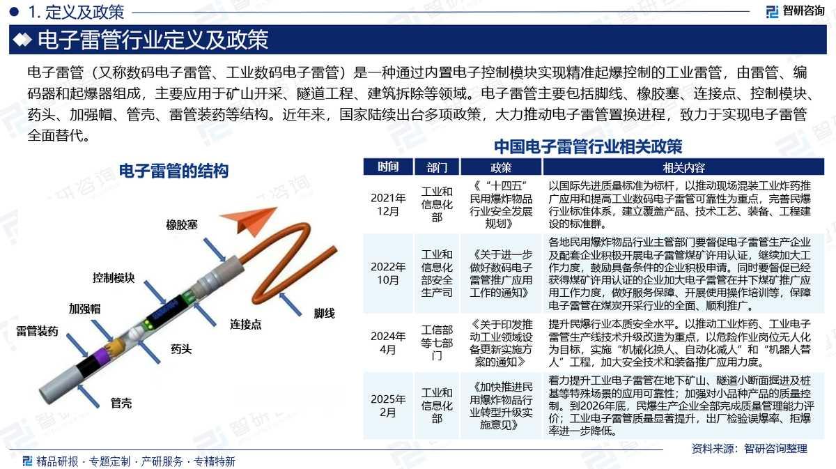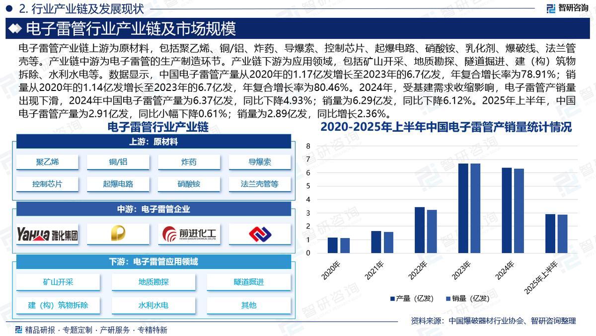 电子雷管(又称数码电子雷管、工业数码电子雷管)是一种通过内置电子控制模块实现精准起爆控制的工业雷管,由雷管、编码器和起爆器组成,主要应用于矿山开采、隧道工程、建筑拆除等领域。电子雷管主要包括脚线、橡胶塞、连接点、控制模块、药头、加强帽、管壳、雷管装药等结构。电子雷管是指采用电子控制模块对起爆过程进行控制的电雷管。与传统的工业雷管相比,电子雷管具有无法比拟的安全性和管控功能,其安全系数高、管理环节方便、社会危害系数低,可以实现火工品的闭合管理,更适应当前爆破行业发展趋势。近年来,在政策强制替代与技术经济性的双重驱动下,中国电子雷管行业实现爆发式增长。中国爆破器材行业协会数据显示,中国电子雷管产量从2020年的1.17亿发增长至2023年的6.7亿发,年复合增长率为78.91%;销量从2020年的1.14亿发增长至2023年的6.7亿发,年复合增长率为80.46%。2024年,受基建需求收缩影响,电子雷管产销量出现下滑,2024年中国电子雷管产量为6.37亿发,同比下降4.93%;销量为6.29亿发,同比下降6.12%。但我国电子雷管渗透率不断提升,产量在工业雷管市场中的占比由2020年的12.24%上升至2024年的94.79%,基本完成对传统雷管的替代。2025年上半年,中国电子雷管产量为2.91亿发,同比小幅下降0.61%;销量为2.89亿发,同比增长2.36%。未来,电子雷管将逐步全面替代导爆管雷管、工业电雷管、其它雷管等其他类型工业雷管,电子雷管将迎来快速发展期。当前,中国电子雷管行业集中度较高,已形成由少数大型企业主导的竞争格局。行业主要企业包括雅化集团、云南民爆、易普力、前进化工、保利联合(维权)、山西壶化等,前五家企业合计占据约50%的市场份额,这些企业凭借显著的规模效应、深厚的技术积累和成熟的品牌影响力,在市场竞争中占据主导地位并构筑起较强的行业壁垒。整体市场呈现出头部企业优势持续巩固、产业集中度稳步提升的发展态势。