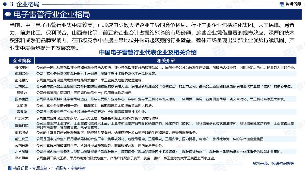 企业格局:当前,中国电子雷管行业集中度较高,已形成由少数大型企业主导的竞争格局。行业主要企业包括雅化集团、云南民爆、易普力、前进化工、保利联合、山西壶化等,前五家企业合计占据约50%的市场份额,这些企业凭借显著的规模效应、深厚的技术积累和成熟的品牌影响力,在市场竞争中占据主导地位并构筑起较强的行业壁垒。整体市场呈现出头部企业优势持续巩固、产业集中度稳步提升的发展态势。